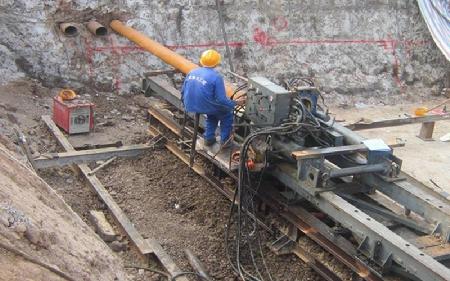 隧道所處地層為粘土及粉質粘土層采用新開發的螺旋出土頂管管幕施工方法和設備進行施工螺旋出土頂管鉆機為動力頭式,輸出旋轉動力。動力頭前端安裝有螺旋鉆桿及螺旋鉆頭,待鋪設的Φ245鋼管在螺旋鉆桿之外。鋼管與螺旋鉆桿之間形成出土空間,定長配套,可接尺。頂進油缸在動力頭后端階段頂進,推動動力頭實現給進。隨著螺旋出土頂管鉆機的轉動,螺旋鉆桿向切削鉆頭傳遞鉆壓和扭矩來切削土屑,并將土屑排到工作坑。頂進油缸向前頂進管道,邊頂進、邊切削、邊輸送,將管道逐段向前鋪設。